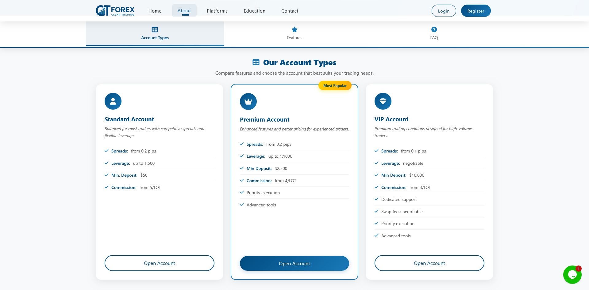CTForex structures its offerings around three account tiers. Each tier differs by deposit requirements rather than meaningful feature improvements.