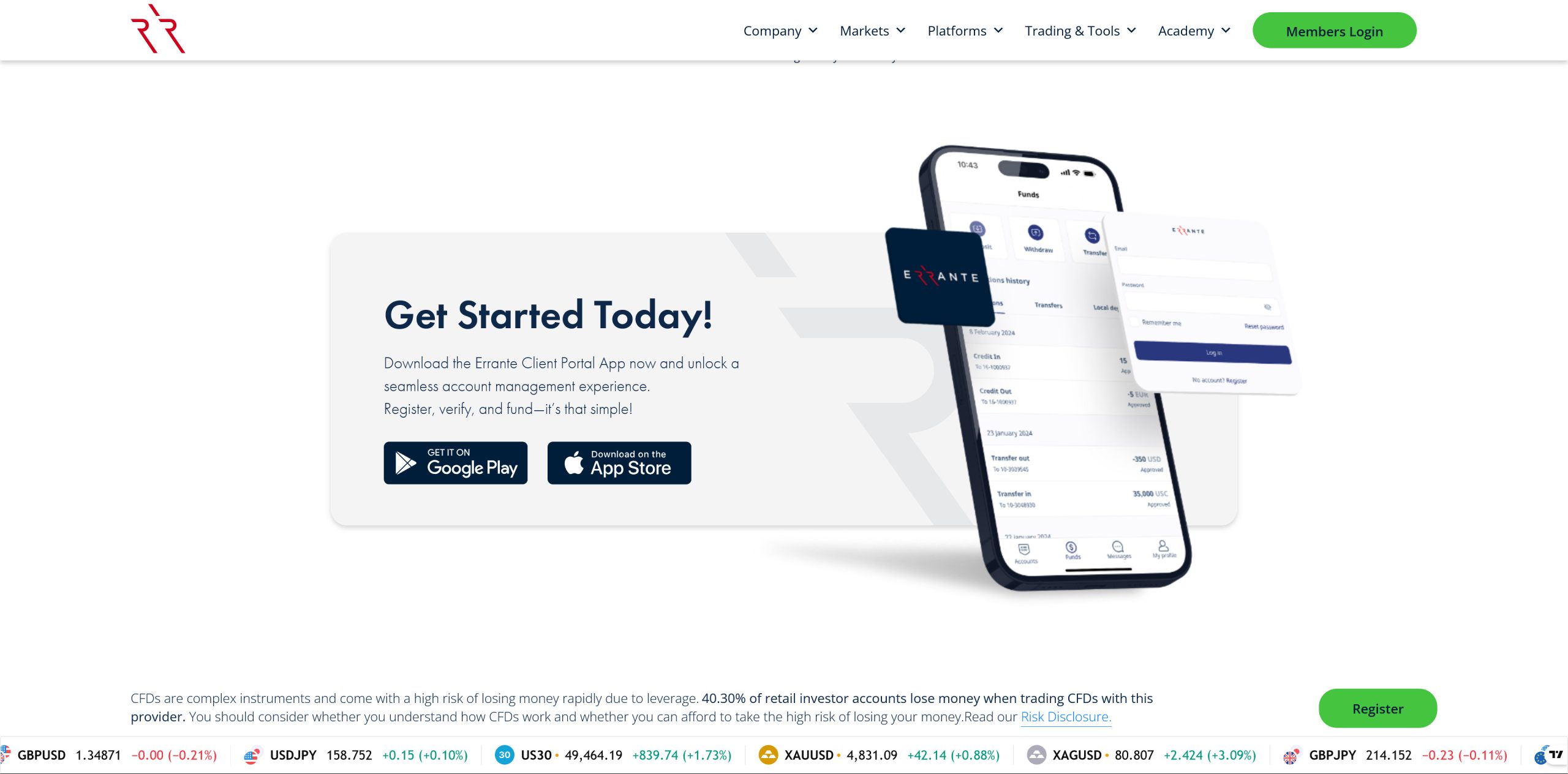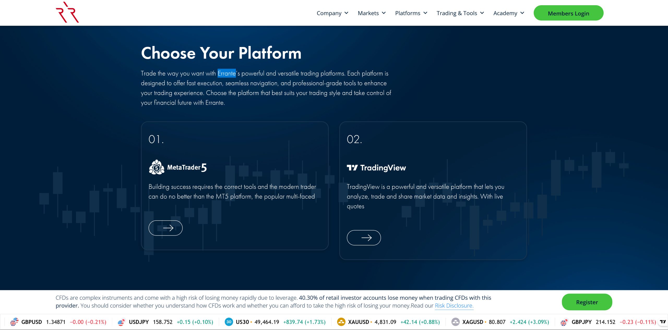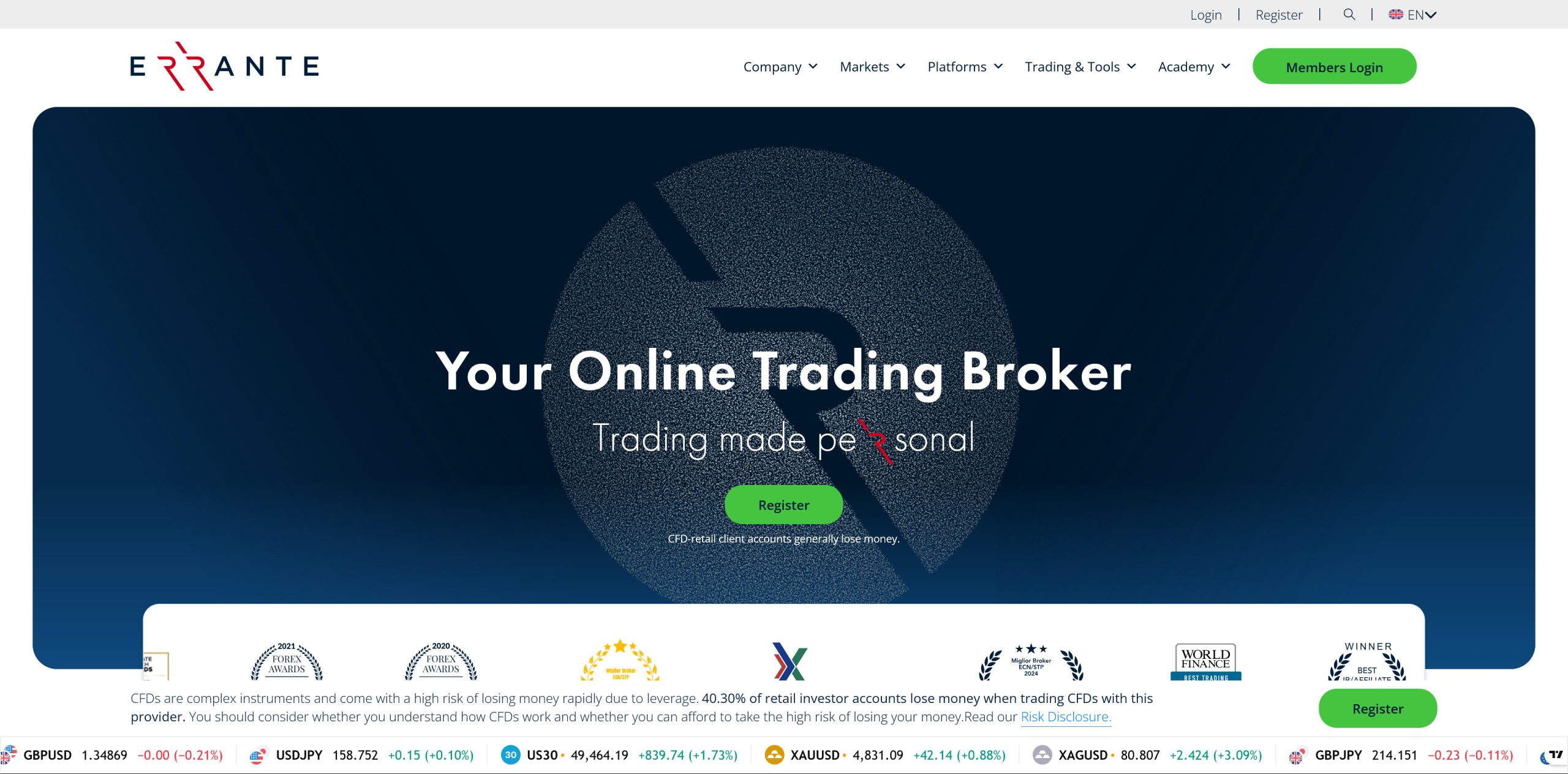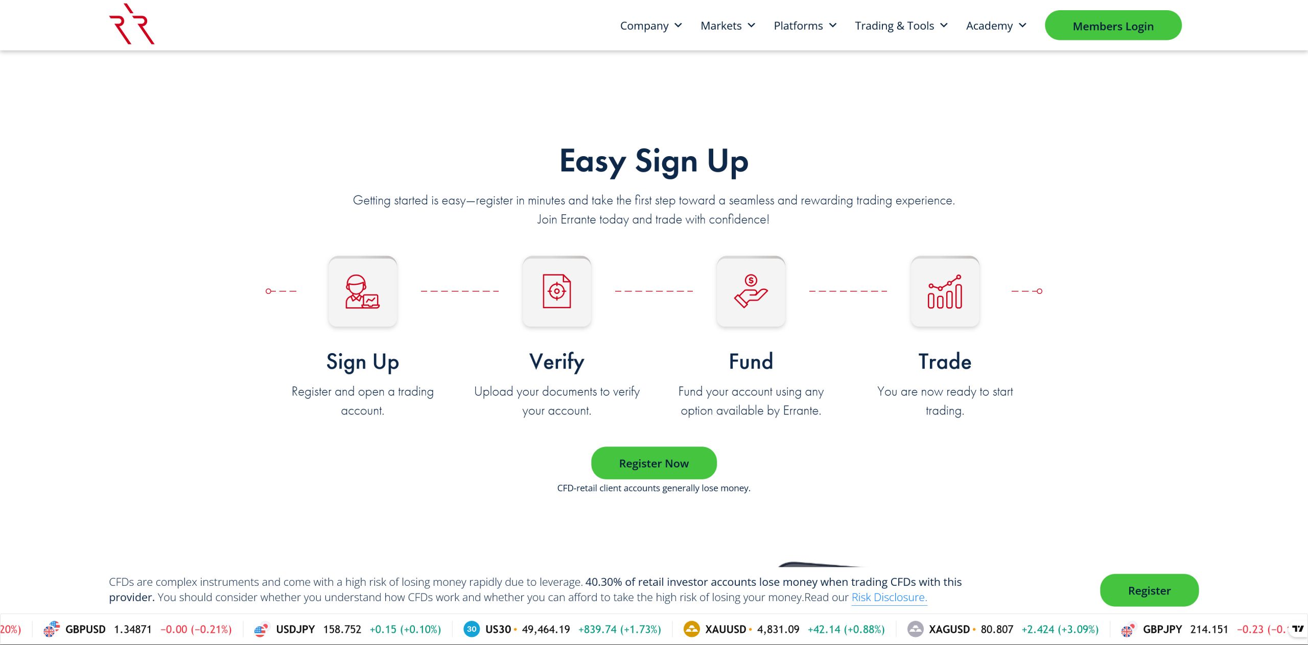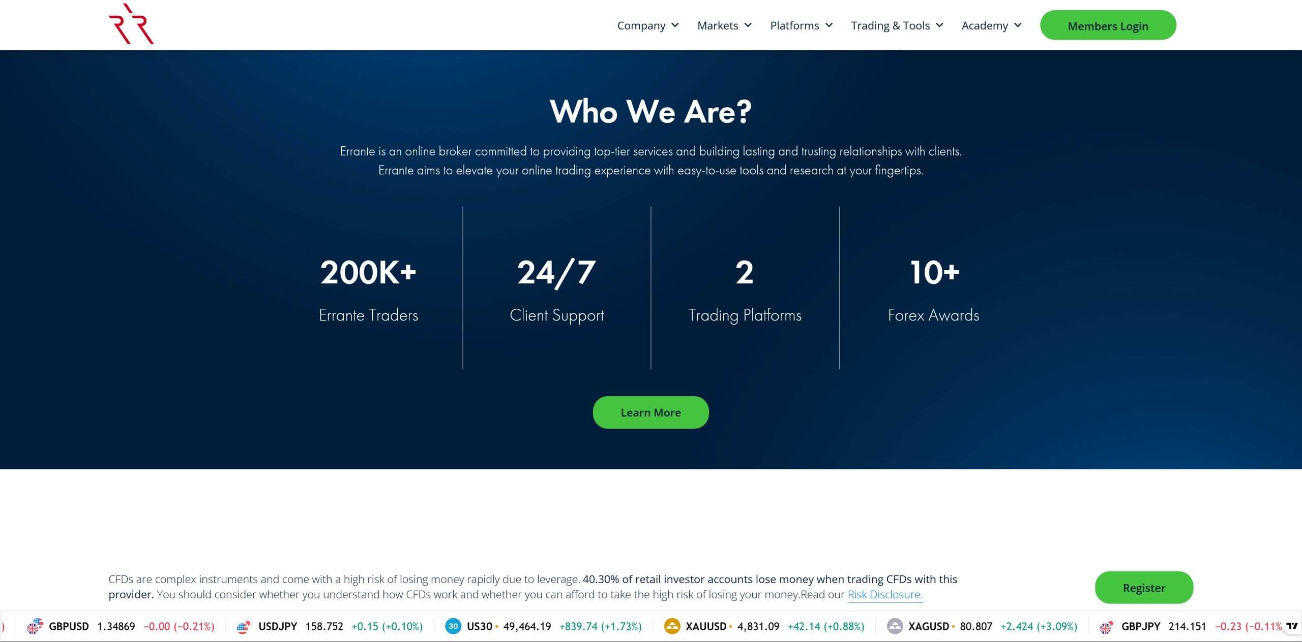 Errante positions itself as a multi-regulated broker offering over 160 CFD instruments, dual regulation under CySEC and FSA (Seychelles), and a minimum deposit of just $50.